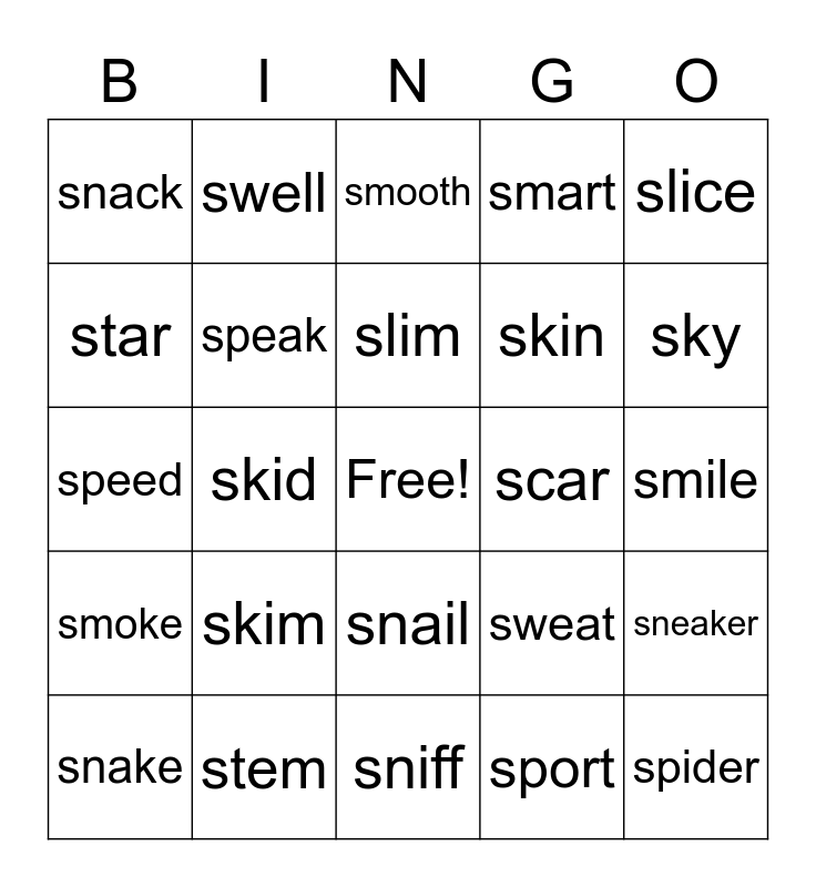This bingo card has a free space and 52 words: spot, spider, smell, sniff, skim, scout, swell, stream, star, scarf, speak, skip, sneaker, sweat, spell, space, slim, scar, snap, slice, skid, sport, snack, skin, sneeze, spill, stamp, stand, sky, still, stake, smart, scale, street, sweet, smooth, stem, stick, skirt, strong, swim, smile, smoke, smack, snail, space, string, speed, spend, stop, snake and snow.