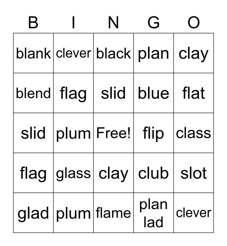 This bingo card has a free space and 37 words: clean, glad, blank, flag, slot, glass, slid, clever, clay, blister, plum, plan, clever, class, blend, flag, slot, black, clay, flip, blank, flat, glad, flame, class, plan lad, clever, flip, glass, flag, black, plum, slid, blank, club, blue and clean.