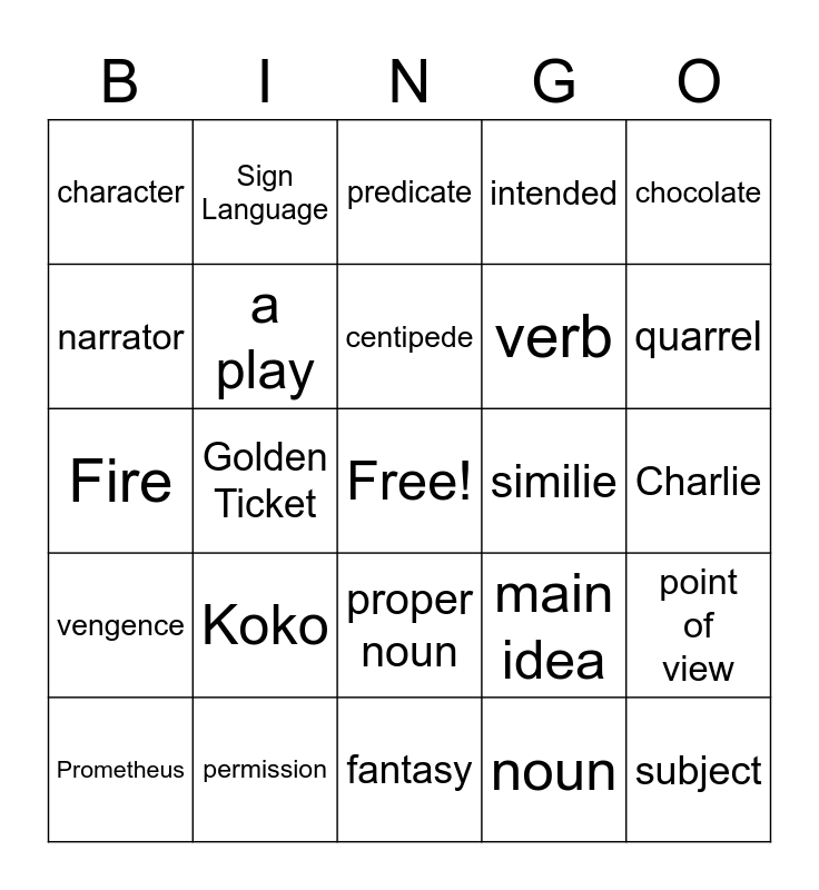 This bingo card has a free space and 24 words: Koko, permission, centipede, Prometheus, chocolate, character, narrator, Sign Language, similie, proper noun, verb, Fire, main idea, point of view, a play, noun, Charlie, predicate, quarrel, Golden Ticket, subject, vengence, intended and fantasy.