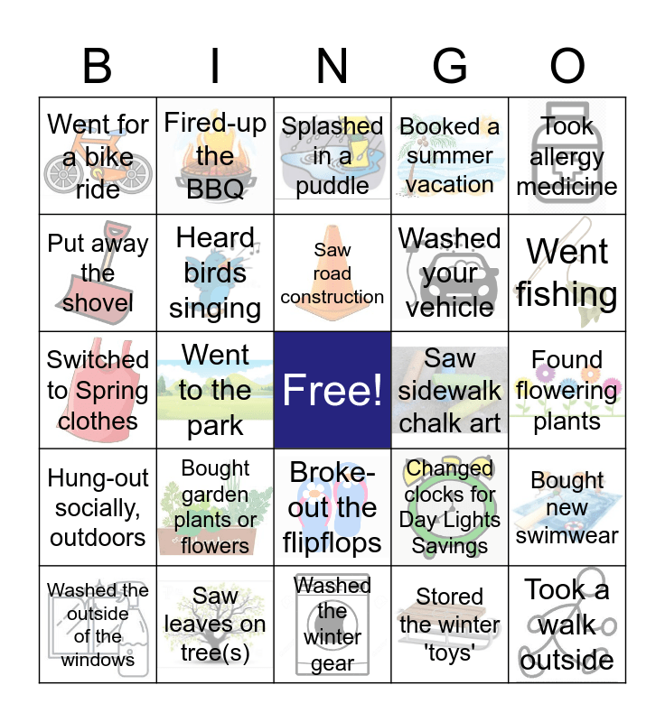 This bingo card has 28 images, a free space and 29 words: Washed the outside of the windows, Rocked my shorts, Went to the park, Got a sunburn already, Went for a bike ride, Splashed in a puddle, Heard birds singing, Bought garden plants or flowers, Saw sidewalk chalk art, Saw leaves on tree(s), Found flowering plants, Took a walk outside, Washed the winter gear, Stored the winter 'toys', Went fishing, Saw a worm, Broke-out the flipflops, Hung-out socially, outdoors, Took allergy medicine, Switched to Spring clothes, Changed clocks for Day Lights Savings, Saw a lemonade stand, Washed your vehicle, Put away the shovel, Booked a summer vacation, Fired-up the BBQ, Bought new swimwear, Saw road construction and Made a S'more.