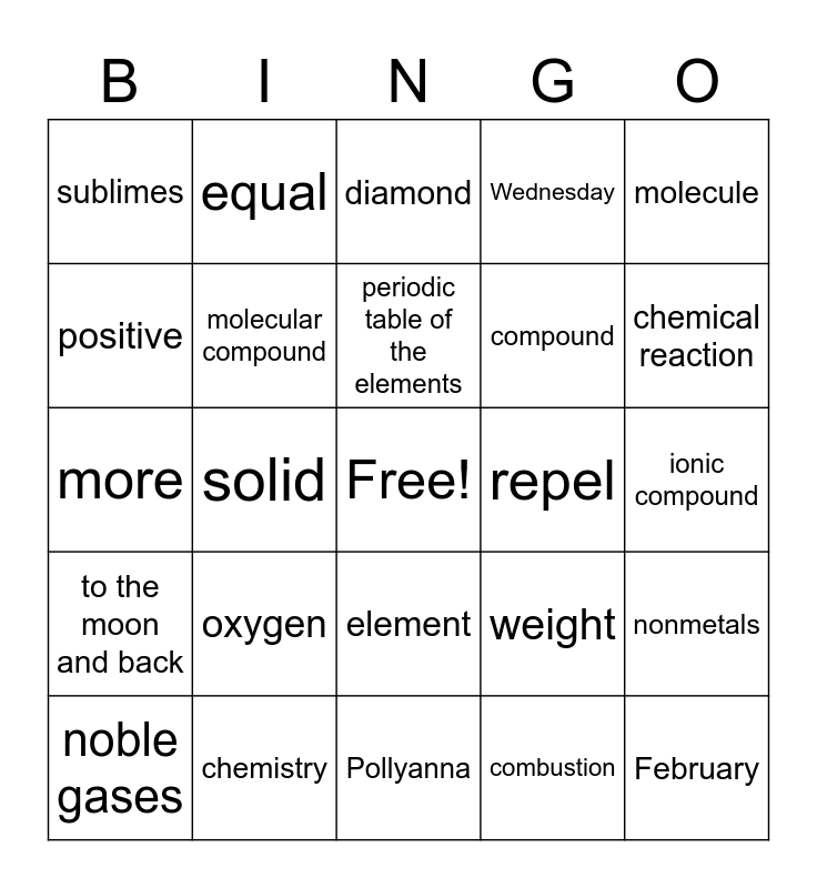 This bingo card has a free space and 24 words: oxygen, chemistry, periodic table of the elements, noble gases, molecule, sublimes, positive, equal, repel, element, compound, more, weight, nonmetals, molecular compound, combustion, ionic compound, diamond, chemical reaction, solid, February, to the moon and back, Wednesday and Pollyanna.