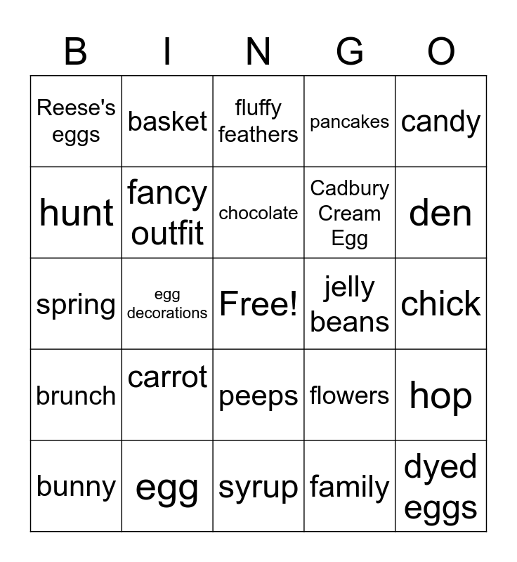 This bingo card has a free space and 24 words: carrot, egg, chocolate, bunny, candy, Reese's eggs, hunt, basket, jelly beans, peeps, Cadbury Cream Egg, spring, flowers, hop, fancy outfit, family, chick, fluffy feathers, den, egg decorations, dyed eggs, brunch, pancakes and syrup.