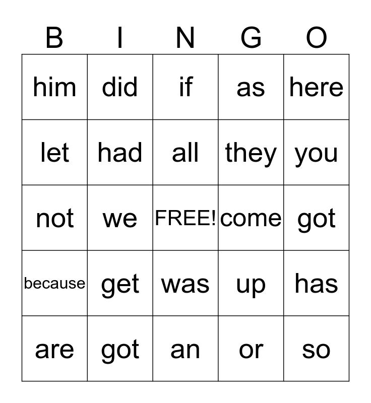 This bingo card has a free space and 24 words: get, got, all, are, here, him, let, did, come, was, they, not, up, has, had, or, got, if, you, we, so, because, as and an.