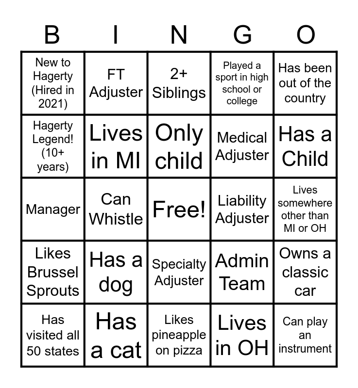 This bingo card has a free space and 24 words: Has a dog, Has a cat, Only child, Has visited all 50 states, Has been out of the country, New to Hagerty (Hired in 2021), Hagerty Legend! (10+ years), FT Adjuster, Liability Adjuster, Specialty Adjuster, Medical Adjuster, Manager, Admin Team, Owns a classic car, Lives in MI, Lives in OH, Lives somewhere other than MI or OH, 2+ Siblings, Has a Child, Can Whistle, Can play an instrument, Likes Brussel Sprouts, Played a sport in high school or college and Likes pineapple on pizza.