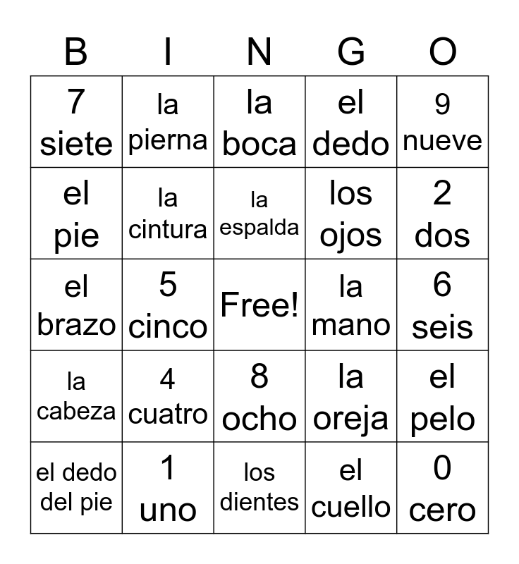 This bingo card has a free space and 27 words: la oreja, la nariz, los ojos, los dientes, el pie, la boca, la pierna, la cabeza, la mano, el pelo, el brazo, el dedo, el dedo del pie, 1 uno, 2 dos, 3 tres, la cintura, la espalda, 4 cuatro, 7 siete, 6 seis, el cuello, 5 cinco, 0 cero, 8 ocho, 9 nueve and 10 dies.