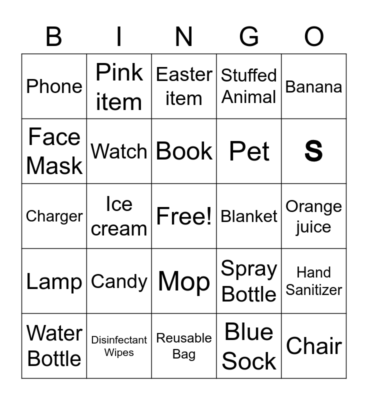 This bingo card has a free space and 24 words: Water Bottle, Candy, Book, Blue Sock, Banana, Phone, Pink item, Easter item, Blanket, Orange juice, Charger, Watch, Spray Bottle, Hand Sanitizer, Face Mask, Disinfectant Wipes, Reusable Bag, Stuffed Animal, S, Lamp, Ice cream, Mop, Pet and Chair.