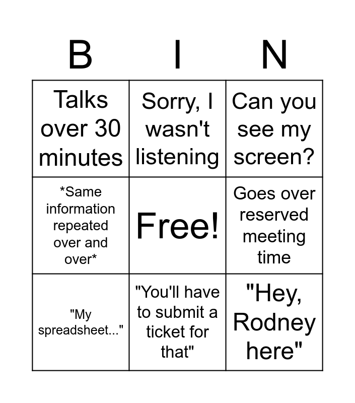 This bingo card has a free space and 9 words: "My spreadsheet...", Can you see my screen?, Sorry, I wasn't listening, *Same information repeated over and over*, Talks over 30 minutes, Goes over reserved meeting time, "Hey, Rodney here", "One more thing" and "You'll have to submit a ticket for that".