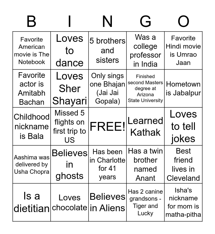 This bingo card has a free space and 24 words: Believes in ghosts, Loves chocolate, Only sings one Bhajan (Jai Jai Gopala), Is a dietitian, Favorite Hindi movie is Umrao Jaan, Favorite American movie is The Notebook, Favorite actor is Amitabh Bachan, Loves to dance, Learned Kathak, Has been in Charlotte for 41 years, Finished second Masters degree at Arizona State University, Childhood nickname is Bala, Has a twin brother named Anant, Best friend lives in Cleveland, Loves Sher Shayari, Has 2 canine grandsons - Tiger and Lucky, Loves to tell jokes, 5 brothers and sisters, Hometown is Jabalpur, Missed 5 flights on first trip to US, Isha's nickname for mom is matha-pitha, Aashima was delivered by Usha Chopra, Was a college professor in India and Believes in Aliens.