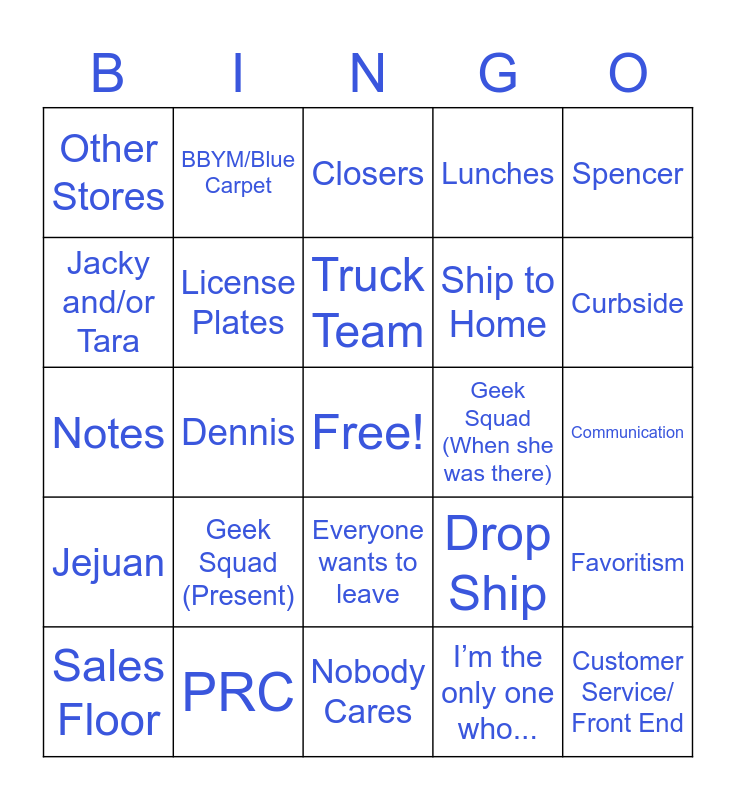 This bingo card has a free space and 24 words: Geek Squad (Present), PRC, Truck Team, Sales Floor, Spencer, Other Stores, Jacky and/or Tara, BBYM/Blue Carpet, Geek Squad (When she was there), Everyone wants to leave, Ship to Home, Notes, Drop Ship, Favoritism, License Plates, I’m the only one who..., Communication, Closers, Curbside, Dennis, Customer Service/ Front End, Jejuan, Lunches and Nobody Cares.