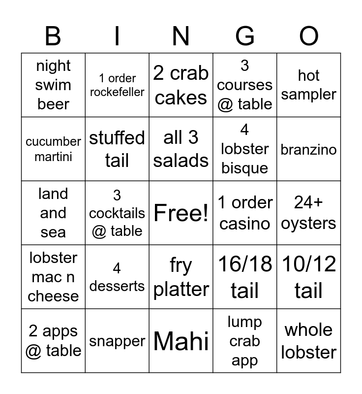 This bingo card has a free space and 24 words: 4 desserts, snapper, all 3 salads, 2 apps @ table, hot sampler, night swim beer, cucumber martini, 1 order rockefeller, 1 order casino, fry platter, 4 lobster bisque, land and sea, 16/18 tail, 10/12 tail, stuffed tail, lump crab app, 24+ oysters, 2 crab cakes, branzino, 3 cocktails @ table, whole lobster, lobster mac n cheese, 3 courses @ table and Mahi.