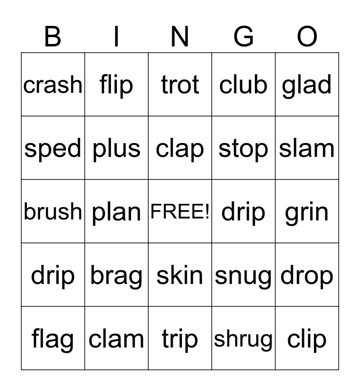 This bingo card has a free space and 24 words: brag, clam, clap, flag, glad, crash, sped, flip, drip, skin, stop, brush, snug, drop, plus, shrug, grin, trot, slam, plan, clip, drip, club and trip.
