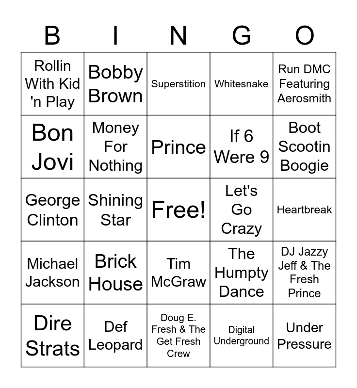 This bingo card has a free space and 122 words: Earth Wind & Fire, Metallica, Jimi Hendrix, The Beatles, Bob Seger & The Silver Bullet Band, Black Sabbath, Bobby Brown, Rob Base, Doug E. Fresh & The Get Fresh Crew, Cyndi Lauper, Brooks & Dunn, David Bowie & Queen, Garth Brooks, Tim McGraw, George Michael, Motley Crue, Dire Strats, New Kids On The Block, New Edition, Run DMC Featuring Aerosmith, Digital Underground, Prince, Stevie Wonder, Bob Marley, Poison, Whitesnake, Def Leopard, Kid 'n Play, Salt-N-Pepa Featuring Experience Unlimited, Nirvana, Wild Cherry, George Clinton, Michael Jackson, Marvin Gaye, Georgia Satellites, Bee Gees, Commodores, Kiss, Van Halen, Eurythmics, The Bangles, Huey Lewis & The News, Tina Turner, No Doubt, Summertime, Wanted Dead or Alive, Cutie Pie, Immigrant Song, I Wanna Dance With Somebody, Shining Star, Enter Sandman, If 6 Were 9, Come Together, That Old Time Rock & Roll, War Pigs, My Prerogative, It Takes Two, The Show, Girls Just Want To Have Fun, Boot Scootin Boogie, Under Pressure, Friends In Low Places, I like It, I Love It, Faith, Wild Side, Money For Nothing, Step By Step, Heartbreak, Walk This Way, The Humpty Dance, Let's Go Crazy, Superstition, 3 Little Birds, I Want Action, Here I Go Again, Pour Some Sugar On Me, Rollin With Kid 'n Play, Shake Your Thang, Come As You Are, Play That Funky Music, Atomic Dog, DJ Jazzy Jeff & The Fresh Prince, Bon Jovi, One Way, Led Zeppelin, Whitney Houston, Earth Wind & Fire, Metallica, Jimi Hendrix, The Beatles, Bob Seger & The Silver Bullet Band, Black Sabbath, Bobby Brown, Rob Base, Doug E. Fresh & The Get Fresh Crew, Cyndi Lauper, Brooks & Dunn, David Bowie & Queen, Garth Brooks, Tim McGraw, George Michael, Motley Crue, Dire Strats, New Kids On The Block, New Edition, Run DMC Featuring Aerosmith, Digital Underground, Prince, Stevie Wonder, Bob Marley, Don't Stop 'til You Get Enough, Got To Give It Up, Keep Your Hands To Yourself, Stayin Alive, Brick House, Rock And Roll All Nite, Jump, Sweet Dreams, Walk Like An Egyptian, The Power of Love, What's Love Got toDo With It and Just A Girl.