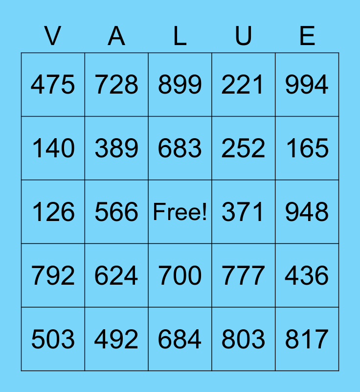 This bingo card has a free space and 24 words: 624, 492, 683, 503, 994, 475, 140, 728, 371, 700, 252, 126, 777, 436, 389, 803, 948, 899, 165, 566, 817, 792, 221 and 684.