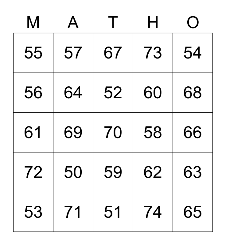 This bingo card has 25 words: 50, 51, 52, 53, 54, 55, 56, 57, 58, 59, 60, 61, 62, 63, 64, 65, 66, 67, 68, 69, 70, 71, 72, 73 and 74.