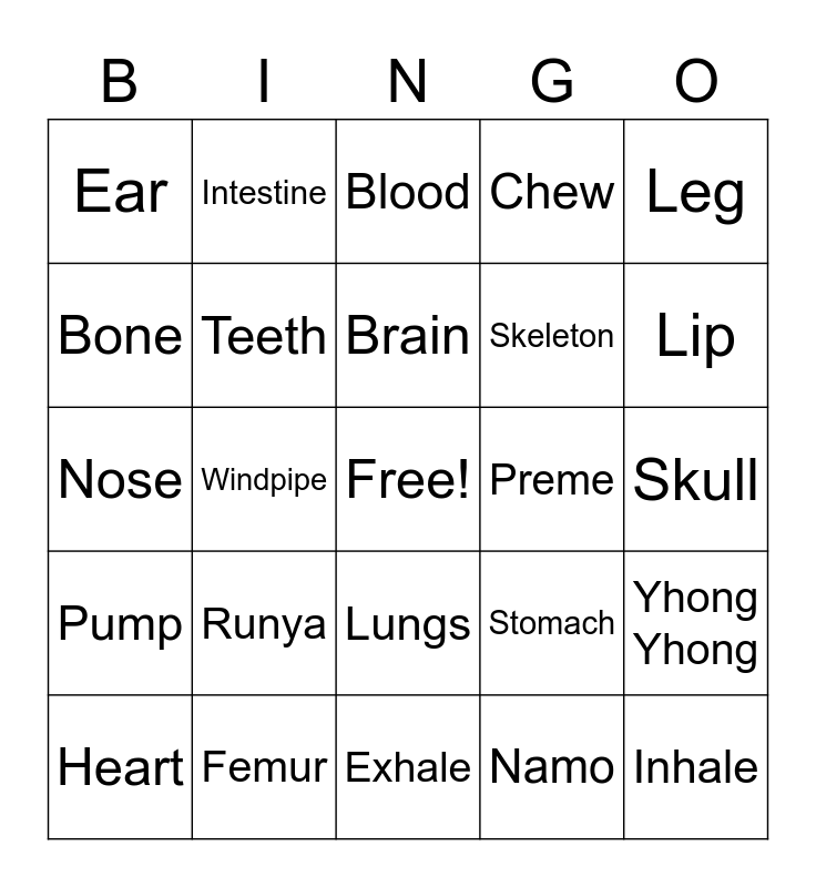 This bingo card has a free space and 24 words: Runya, Femur, Brain, Heart, Leg, Ear, Bone, Intestine, Preme, Lungs, Skeleton, Nose, Stomach, Yhong Yhong, Teeth, Namo, Skull, Blood, Lip, Windpipe, Inhale, Pump, Chew and Exhale.