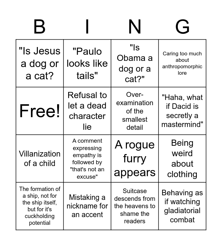 This bingo card has 16 words: Mistaking a nickname for an accent, Being weird about clothing, "Is Obama a dog or a cat?", "Is Jesus a dog or a cat?, Villanization of a child, "Paulo looks like tails", A rogue furry appears, Suitcase descends from the heavens to shame the readers, Free!, Refusal to let a dead character lie, The formation of a ship, not for the ship itself, but for it's cuckholding potential, Caring too much about anthropomorphic lore, A comment expressing empathy is followed by "that's not an excuse", "Haha, what if Dacid is secretly a mastermind", Over-examination of the smallest detail and Behaving as if watching gladiatorial combat.