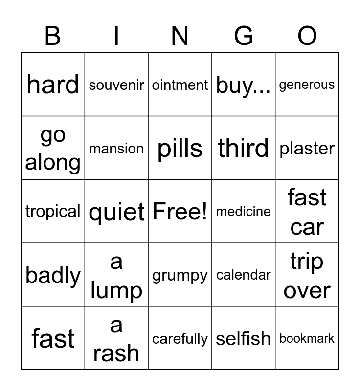 This bingo card has a free space and 24 words: a lump, a rash, pills, fast, generous, hard, go along, souvenir, medicine, grumpy, third, tropical, calendar, trip over, mansion, selfish, fast car, ointment, plaster, quiet, bookmark, badly, buy... and carefully.
