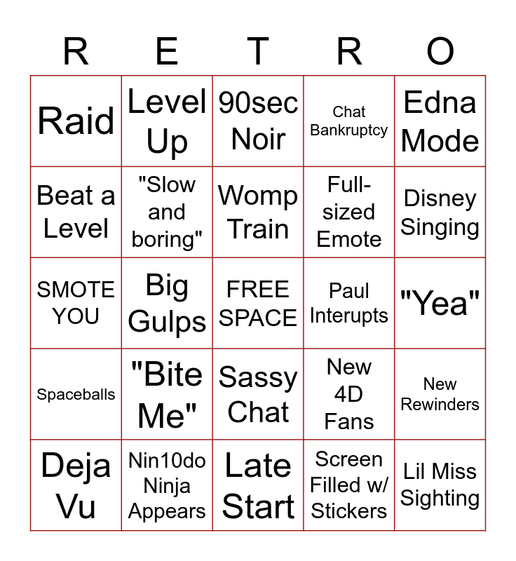 This bingo card has a free space and 24 words: "Bite Me", Nin10do Ninja Appears, Womp Train, Deja Vu, Edna Mode, Raid, Beat a Level, Level Up, Paul Interupts, Sassy Chat, Full-sized Emote, SMOTE YOU, New 4D Fans, New Rewinders, "Slow and boring", Screen Filled w/ Stickers, "Yea", 90sec Noir, Disney Singing, Big Gulps, Lil Miss Sighting, Spaceballs, Chat Bankruptcy and Late Start.