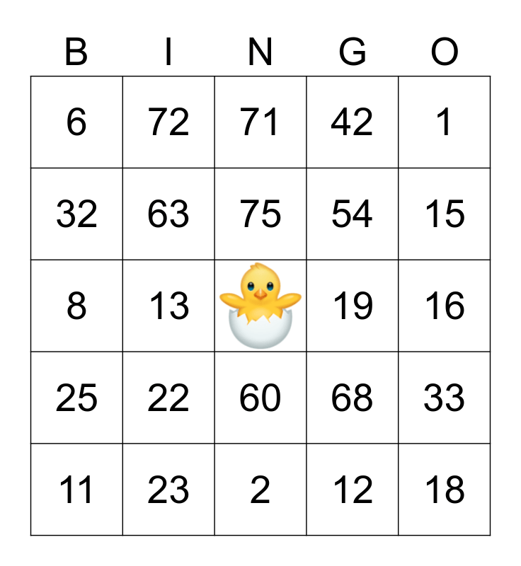 This bingo card has a free space and 24 words: 22, 23, 75, 11, 1, 6, 32, 72, 19, 60, 54, 8, 68, 33, 63, 12, 16, 71, 15, 13, 18, 25, 42 and 2.