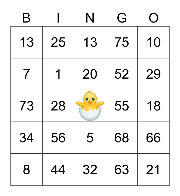 This bingo card has a free space and 24 words: 56, 44, 20, 8, 10, 13, 7, 25, 55, 5, 52, 73, 68, 66, 1, 63, 18, 13, 29, 28, 21, 34, 75 and 32.