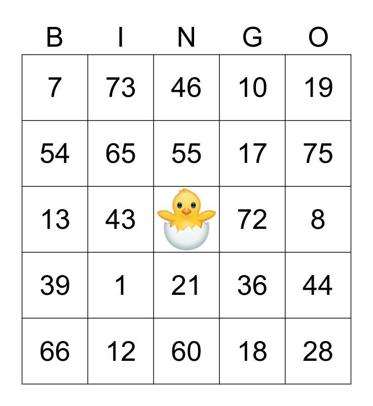 This bingo card has a free space and 24 words: 1, 12, 55, 66, 19, 7, 54, 73, 72, 21, 17, 13, 36, 44, 65, 18, 8, 46, 75, 43, 28, 39, 10 and 60.
