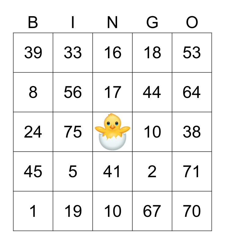 This bingo card has a free space and 24 words: 5, 19, 17, 1, 53, 39, 8, 33, 10, 41, 44, 24, 2, 71, 56, 67, 38, 16, 64, 75, 70, 45, 18 and 10.