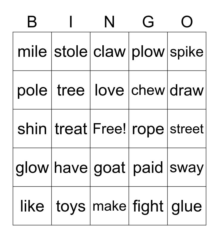 This bingo card has a free space and 25 words: have, make, love, like, spike, mile, pole, stole, rope, goat, chew, shin, paid, sway, tree, reach, street, claw, draw, treat, glue, toys, glow, plow and fight.