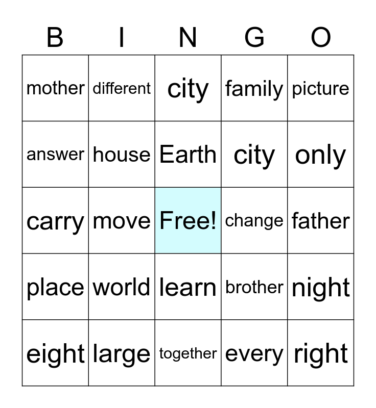 This bingo card has a free space and 24 words: world, large, Earth, eight, picture, mother, answer, different, change, learn, city, carry, brother, night, house, every, father, city, only, move, right, place, family and together.