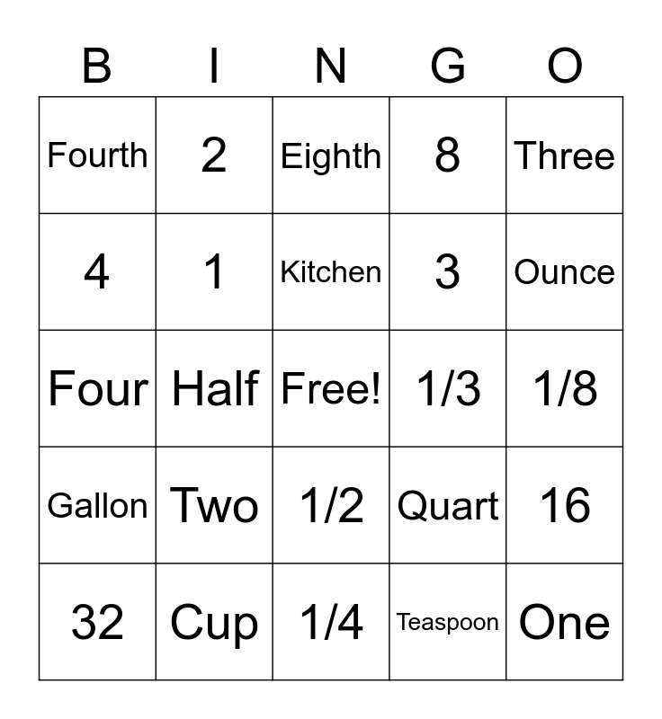 This bingo card has a free space and 30 words: Cup, Spoon, Half, Third, Fourth, Eighth, 1, 1/2, 1/3, 1/4, 1/8, One, Teaspoon, Tablespoon, Ounce, Pint, Quart, Gallon, Two, Three, Four, Eight, 2, 3, 4, 8, 16, 32, Kitchen and Measurements.