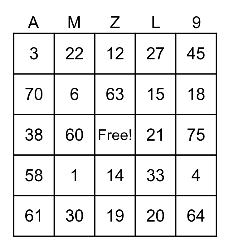 This bingo card has a free space and 24 words: 1, 30, 63, 61, 45, 3, 70, 22, 21, 14, 15, 38, 33, 4, 6, 20, 75, 12, 18, 60, 64, 58, 27 and 19.