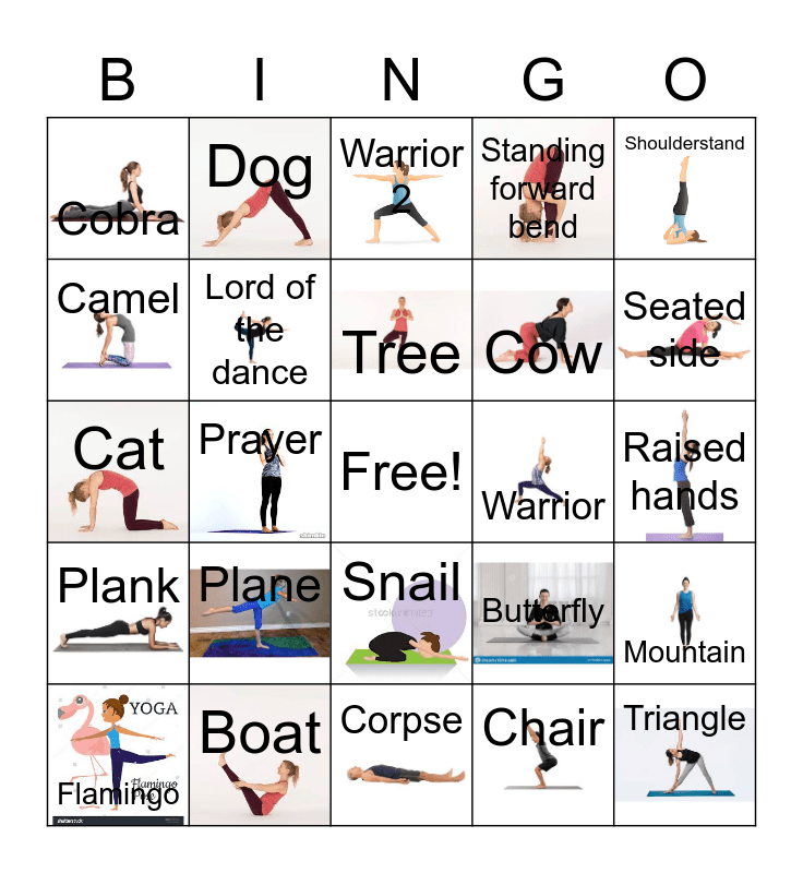 This bingo card has 24 images, a free space and 24 words: Plane, Boat, Tree, Flamingo, Shoulderstand, Cobra, Camel, Dog, Warrior, Snail, Cow, Cat, Butterfly, Mountain, Lord of the dance, Chair, Raised hands, Warrior 2, Seated side, Prayer, Triangle, Plank, Standing forward bend and Corpse.