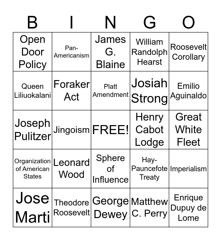 This bingo card has a free space and 28 words: Imperialism, Protectorate, Josiah Strong, Matthew C. Perry, Queen Liliuokalani, James G. Blaine, Pan-Americanism, Organization of American States, Henry Cabot Lodge, Jose Marti, Joseph Pulitzer, William Randolph Hearst, Theodore Roosevelt, George Dewey, Emilio Aguinaldo, Rough Riders, Leonard Wood, Foraker Act, Platt Amendment, Sphere of Influence, Open Door Policy, Boxer Rebellion, Enrique Dupuy de Lome, Jingoism, Great White Fleet, Hay-Pauncefote Treaty, Roosevelt Corollary and Dollar Diplomacy.