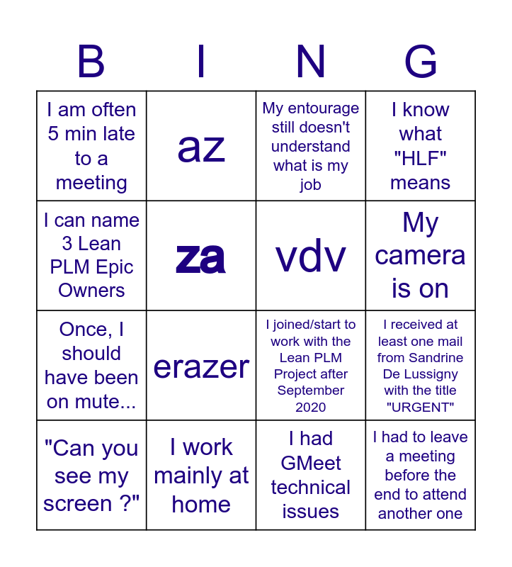 This bingo card has 16 words: I work mainly at home, I received at least one mail from Sandrine De Lussigny with the title "URGENT", My entourage still doesn't understand what is my job, I am often 5 min late to a meeting, Once, I should have been on mute..., az, I joined/start to work with the Lean PLM Project after September 2020, I had GMeet technical issues, I can name 3 Lean PLM Epic Owners, za, "Can you see my screen ?", I know what "HLF" means, erazer, My camera is on, vdv and I had to leave a meeting before the end to attend another one.