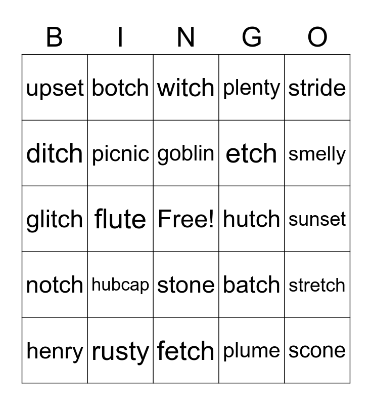 This bingo card has a free space and 27 words: batch, catch, etch, fetch, ditch, witch, botch, notch, hutch, stretch, glitch, plenty, henry, rusty, smelly, submit, picnic, goblin, hubcap, upset, sunset, plume, flute, scone, stone, stride and graze.
