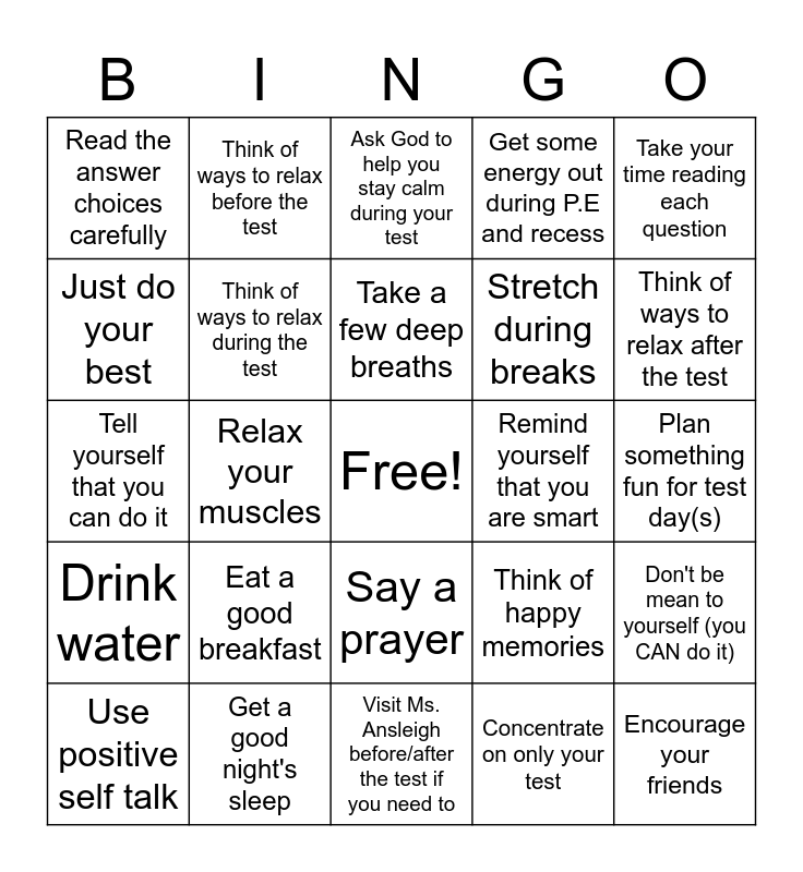 This bingo card has a free space and 24 words: Eat a good breakfast, Get a good night's sleep, Take a few deep breaths, Use positive self talk, Take your time reading each question, Read the answer choices carefully, Just do your best, Think of ways to relax before the test, Remind yourself that you are smart, Say a prayer, Stretch during breaks, Tell yourself that you can do it, Think of happy memories, Don't be mean to yourself (you CAN do it), Think of ways to relax during the test, Concentrate on only your test, Plan something fun for test day(s), Ask God to help you stay calm during your test, Think of ways to relax after the test, Relax your muscles, Encourage your friends, Drink water, Get some energy out during P.E and recess and Visit Ms. Ansleigh before/after the test if you need to.