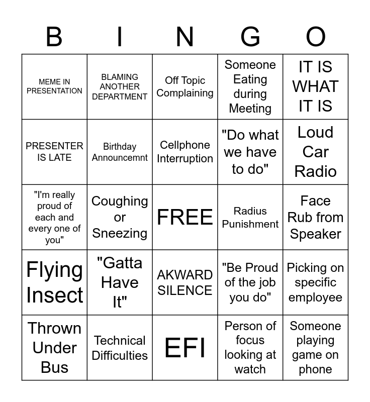 This bingo card has a free space and 24 words: "Gatta Have It", Technical Difficulties, Cellphone Interruption, Thrown Under Bus, IT IS WHAT IT IS, MEME IN PRESENTATION, PRESENTER IS LATE, BLAMING ANOTHER DEPARTMENT, Radius Punishment, AKWARD SILENCE, "Do what we have to do", "I'm really proud of each and every one of you", "Be Proud of the job you do", Picking on specific employee, Birthday Announcemnt, Person of focus looking at watch, Face Rub from Speaker, Off Topic Complaining, Loud Car Radio, Coughing or Sneezing, Someone playing game on phone, Flying Insect, Someone Eating during Meeting and EFI.