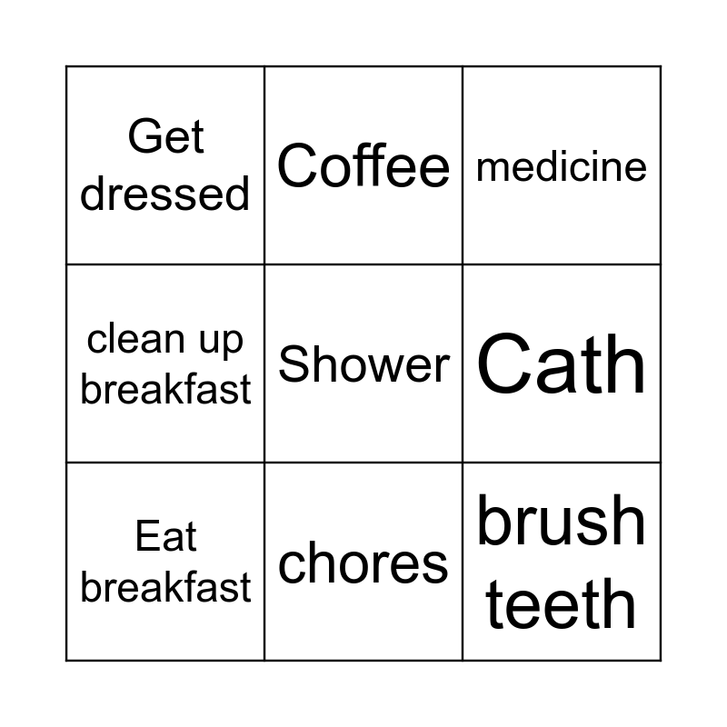 This bingo card has a free space and 8 words: Cath, medicine, Coffee, Eat breakfast, Get dressed, brush teeth, clean up breakfast and chores.