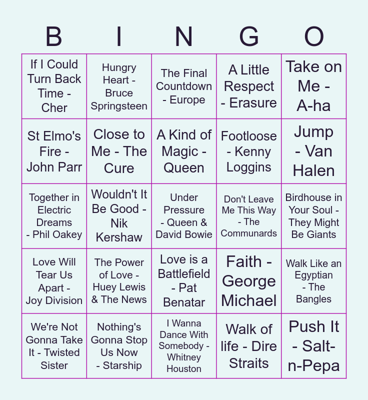 This bingo card has 51 words: Free!, Under Pressure - Queen & David Bowie, I'm Still Standing - Elton John, I Wanna Dance With Somebody - Whitney Houston, The Power of Love - Huey Lewis & The News, Modern Love - David Bowie, Hungry Heart - Bruce Springsteen, Call me - Blondie, St Elmo's Fire - John Parr, You're The Voice - John Farnham, Close to Me - The Cure, A Little Respect - Erasure, Walk Like an Egyptian - The Bangles, Faith - George Michael, Just Can't Get Enough - Depeche Mode, We Didn't Start the Fire - Billy Joel, A Kind of Magic - Queen, Don't Leave Me This Way - The Communards, Here I Go Again - Whitesnake, Take on Me - A-ha, Wouldn't It Be Good - Nik Kershaw, Walk of life - Dire Straits, If I Could Turn Back Time - Cher, Footloose - Kenny Loggins, Eye of the Tiger - Survivor, Push It - Salt-n-Pepa, Jump - Van Halen, Livin' On A Prayer - Bon Jovi, We're Not Gonna Take It - Twisted Sister, The Final Countdown - Europe, Heaven is a Place on Earth - Belinda Carlisle, Tainted Love - Soft Cell, Africa - Toto, Love Shack - B-52s, Don't You (Forget About Me) - Simple Minds, Nothing's Gonna Stop Us Now - Starship, I Melt With You - Modern English, Everybody Wants to Rule the World - Tears for Fears, Here Comes Your Man - Pixies, The Killing Moon - Echo and the Bunnymen, Birdhouse in Your Soul - They Might Be Giants, Love Will Tear Us Apart - Joy Division, Pump It Up - Elvis Costello..., Going Underground - The Jam, I Think We're Alone Now - Tiffany, Girls Just Wanna Have Fun - Cyndi Lauper, Together in Electric Dreams - Phil Oakey, Girls on Film - Duran Duran, Material Girl - Madonna, Love is a Battlefield - Pat Benatar and 9 to 5 - Dolly Parton.