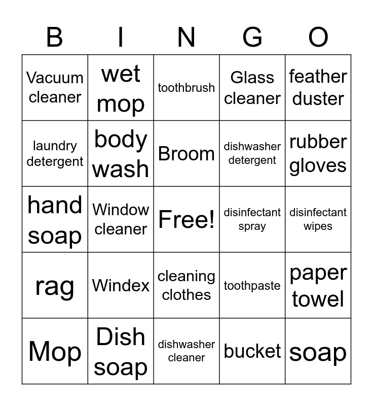 This bingo card has a free space and 24 words: Windex, Dish soap, Broom, Mop, feather duster, Vacuum cleaner, laundry detergent, wet mop, disinfectant spray, cleaning clothes, dishwasher detergent, hand soap, toothpaste, paper towel, body wash, bucket, disinfectant wipes, toothbrush, rubber gloves, Window cleaner, soap, rag, Glass cleaner and dishwasher cleaner.