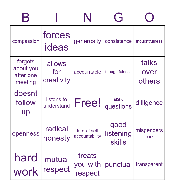 This bingo card has a free space and 24 words: radical honesty, mutual respect, accountable, hard work, thoughtfulness, compassion, forgets about you after one meeting, forces ideas, ask questions, lack of self accountability, thoughtfulness, doesnt follow up, good listening skills, misgenders me, allows for creativity, punctual, dilligence, generosity, talks over others, listens to understand, transparent, openness, consistence and treats you with respect.