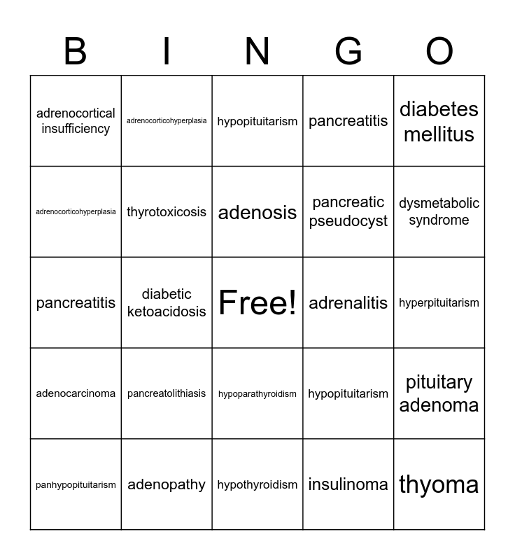 This bingo card has a free space and 61 words: adenitis, adenopathy, polyadenopathy, adenocarcinoma, insulinoma, thyroiditis, thyrotoxicosis, hyperpituitarism, pancreatic pseudocyst, pancreatolith, pancreatitis, hyperparathyroidism, adrenocorticohyperplasia, pituitary infarction, ketosis, adrenocortical insufficiency, thyoma, diabetes mellitus, diabetic ketoacidosis, adenosis, adrenalitis, hypopituitarism, panhypopituitarism, pituitary adenoma, hypothyroidism, adenitis, adenopathy, adenosis, dysmetabolic syndrome, ketosis, polyadenopathy, adrenal insufficiency, adrenalitis, adrenocortical insufficiency, adrenocorticohyperplasia, congenital adrenal hyperplasia, diabetes mellitus, diabetic ketoacidosis, pancreatic pseudocyst, pancreatitis, pancreatolith, pancreatolithiasis, hyperpituitarism, hypophysitis, hypopituitarism, panhypopituitarism, pituitary infarction, hyperparathyroidism, hyperthyroidism, hypoparathyroidism, hypothyroidism, thyroiditis, thyrotoxicosis, adenocarcinoma, adenoma, adrenal adenoma, adrenocortical carcinoma, insulinoma, parathyroidoma, pituitary adenoma and thymoma.