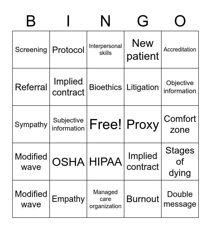 This bingo card has a free space and 24 words: OSHA, Empathy, Bioethics, Modified wave, Accreditation, Screening, Referral, Protocol, Proxy, HIPAA, Litigation, Sympathy, Implied contract, Stages of dying, Implied contract, Burnout, Comfort zone, Interpersonal skills, Objective information, Subjective information, Double message, Modified wave, New patient and Managed care organization.
