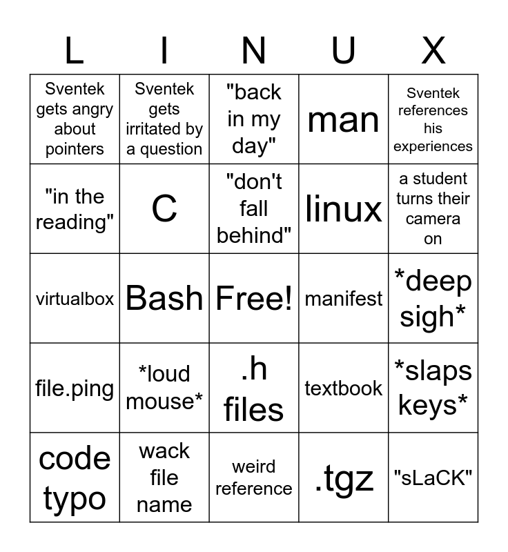 This bingo card has a free space and 24 words: *loud mouse*, wack file name, "don't fall behind", code typo, Sventek references his experiences, Sventek gets angry about pointers, "in the reading", Sventek gets irritated by a question, manifest, .h files, linux, virtualbox, textbook, *slaps keys*, C, .tgz, *deep sigh*, "back in my day", a student turns their camera on, Bash, "sLaCK", file.ping, man and weird reference.