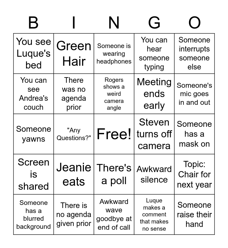 This bingo card has a free space and 24 words: Jeanie eats, There is no agenda given prior, Rogers shows a weird camera angle, Someone has a blurred background, Someone interrupts someone else, You see Luque's bed, You can see Andrea's couch, Green Hair, Steven turns off camera, There's a poll, Meeting ends early, Someone yawns, Awkward silence, Topic: Chair for next year, There was no agenda prior, Luque makes a comment that makes no sense, Someone has a mask on, Someone is wearing headphones, Someone's mic goes in and out, "Any Questions?", Someone raise their hand, Screen is shared, You can hear someone typing and Awkward wave goodbye at end of call.