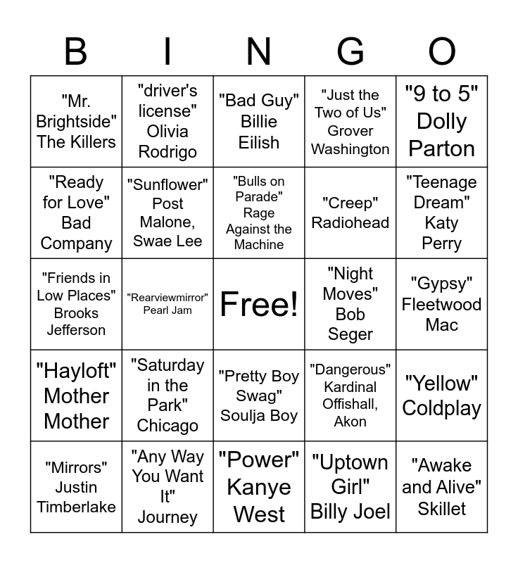 This bingo card has a free space and 29 words: "Mirrors" Justin Timberlake, "Howlin' for You" The Black Keys, "Rearviewmirror" Pearl Jam, "Sicko Mode" Travis Scott, "Mr. Brightside" The Killers, "Bad Guy" Billie Eilish, "Sunflower" Post Malone, Swae Lee, "Saturday in the Park" Chicago, "Night Moves" Bob Seger, "Any Way You Want It" Journey, "Gypsy" Fleetwood Mac, "Awake and Alive" Skillet, "Power" Kanye West, "Uptown Girl" Billy Joel, "Teenage Dream" Katy Perry, "Midnight City" M83, "Pretty Boy Swag" Soulja Boy, "Hayloft" Mother Mother, "9 to 5" Dolly Parton, "Friends in Low Places" Brooks Jefferson, "Dangerous" Kardinal Offishall, Akon, "Cupid's Chokehold/Breakfast in America" Gym Class Heroes, "Creep" Radiohead, "Ready for Love" Bad Company, "Just the Two of Us" Grover Washington, "driver's license" Olivia Rodrigo, "Yellow" Coldplay, "Bulls on Parade" Rage Against the Machine and "Headstrong" Trapt.