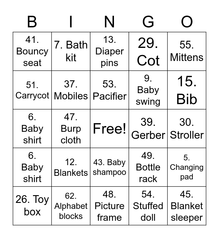 ⚠ This card has duplicate items: . Blankie (3), 2. High chair (3), 3. Teddy bear (3), 4. Rubber duck (3), 5. Changing pad (3), 6. Baby shirt (3), 7. Bath kit (3), 8. Baby powder (3), 9. Baby swing (3), 10. Play gym (3), 11. Moses basket (3), 12. Blankets (3), 13. Diaper pins (3), 14. Clothes (3), 15. Bib (3), 16. Music CD (3), 17. Baby hat (3), 18. Teether (3), 19. Bottle (3), 20. Teething ring (3), 21. Baby food (3), 22. Pram suit (3), 23. Gift card (3), 24. Memory journal (3), 25. Baby walker (3), 26. Toy box (3), 27. Diapers (3), 28. Baby food blend (3), 29. Cot (3), 30. Stroller (3), 31. Baby monitor (3), 32. Layette (3), 33. Baby lotion (3), 34. Towel (3), 35. Playpen (3), 36. Bassinet (3), 37. Mobiles (3), 38. Baby socks (3), 39. Gerber (3), 40. Baby book (3), 41. Bouncy seat (3), 42. Onesie (3), 43. Baby shampoo (3), 44. Cradle (3), 45. Blanket sleeper (3), 46. Diaper bag (3), 47. Burp cloth (3), 48. Picture frame (3), 49. Bottle rack (3), 50. Bonnet (3), 51. Carrycot (3), 52. Security blanket (3), 53. Pacifier (3), 54. Stuffed doll (3), 55. Mittens (3)