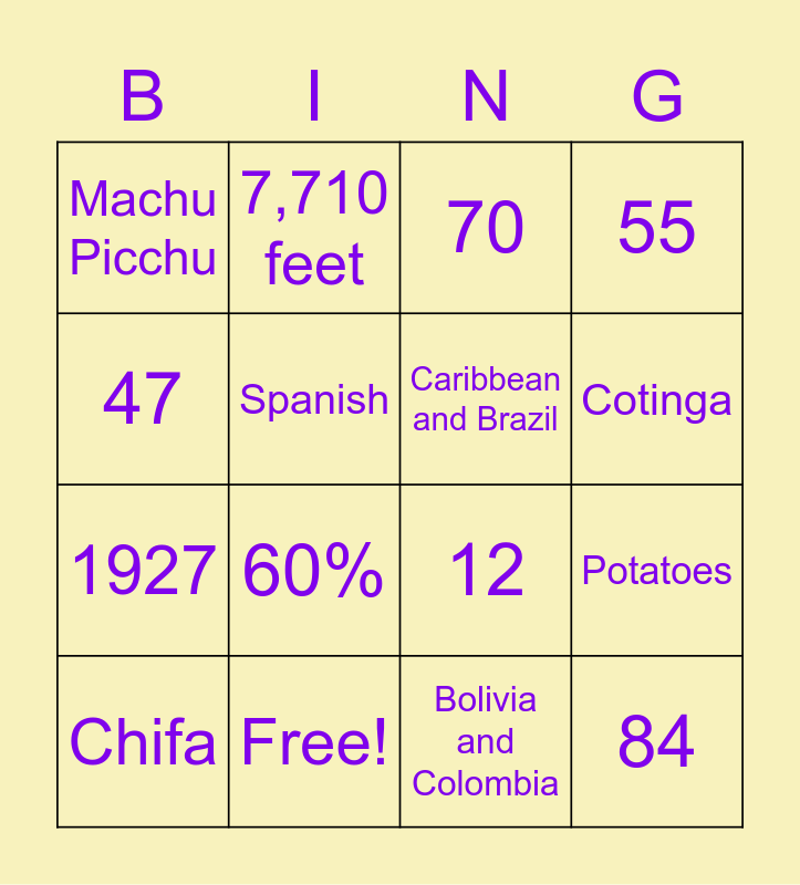 This bingo card has 24 words: Lima, Chile, Cotinga, 122 years ago, 47, Machu Picchu, Spanish, 7,710 feet, Free!, Cerro Blanco, 1927, 12, Vicuñas, Nikkei Peruanos, Caribbean and Brazil, Cantua Buxifolia, Bolivia and Colombia, 70, 60%, Potatoes, Chifa, 84, 55 and Lomo Saltado and Ceviche.