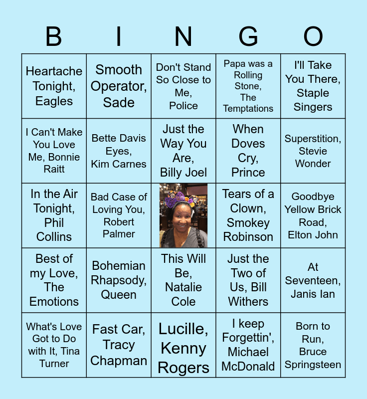 This bingo card has a free space and 31 words: Lucille, Kenny Rogers, We will Rock You, Queen, Bad Case of Loving You, Robert Palmer, Chuck E's In Love, Rickie Lee Jones, Heartache Tonight, Eagles, Don't Stand So Close to Me, Police, Bette Davis Eyes, Kim Carnes, Just the Two of Us, Bill Withers, Tears of a Clown, Smokey Robinson, I keep Forgettin', Michael McDonald, Goodbye Yellow Brick Road, Elton John, Born to Run, Bruce Springsteen, Midnight Train to Georgia, Gladys Knight, I Wanna Dance with Somebody, Whitney Houston, Superstition, Stevie Wonder, Tired of Being Alone, Al Green, At Seventeen, Janis Ian, Bohemian Rhapsody, Queen, Best of my Love, The Emotions, This Will Be, Natalie Cole, I'll Take You There, Staple Singers, Sara Smile, Hall & Oats, What's Love Got to Do with It, Tina Turner, Smooth Operator, Sade, When Doves Cry, Prince, I Can't Make You Love Me, Bonnie Raitt, Papa was a Rolling Stone, The Temptations, In the Air Tonight, Phil Collins, Fast Car, Tracy Chapman, Just the Way You Are, Billy Joel and Tears in Heaven, Eric Clapton.