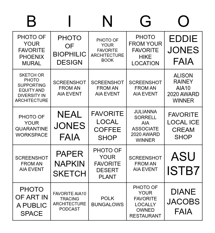 This bingo card has 25 words: PAPER NAPKIN SKETCH, POLK BUNGALOWS, SCREENSHOT FROM AN AIA EVENT, PHOTO OF ART IN A PUBLIC SPACE, EDDIE JONES FAIA, PHOTO OF YOUR FAVORITE PHOENIX MURAL, SKETCH OR PHOTO SUPPORTING EQUITY AND DIVERSITY IN ARCHITECTURE, PHOTO OF BIOPHILIC DESIGN, JULIANNA SORRELL AIA ASSOCIATE 2020 AWARD WINNER, PHOTO OF YOUR FAVORITE DESERT PLANT, SCREENSHOT FROM AN AIA EVENT, PHOTO OF YOUR QUARANTINE WORKSPACE, SCREENSHOT FROM AN AIA EVENT, ASU ISTB7, SCREENSHOT FROM AN AIA EVENT, DIANE JACOBS FAIA, FAVORITE LOCAL ICE CREAM SHOP, PHOTO OF YOUR FAVORITE ARCHITECTURE BOOK, ALISON RAINEY AIA10 2020 AWARD WINNER, NEAL JONES FAIA, FAVORITE LOCAL COFFEE SHOP, FAVORITE AIA10 TRACING ARCHITECTURE PODCAST, SCREENSHOT FROM AN AIA EVENT, PHOTO FROM YOUR FAVORITE HIKE LOCATION and PHOTO OF YOUR FAVORITE LOCALLY OWNED RESTAURANT.