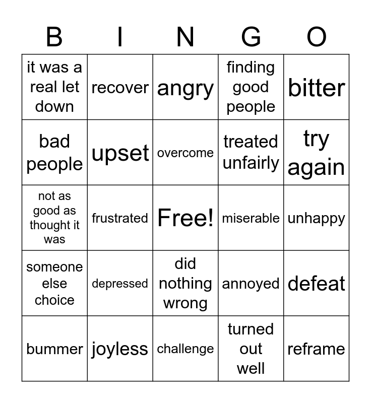 This bingo card has a free space and 29 words: bummer, sad, frustrated, thats too bad, it was a real let down, angry, upset, depressed, miserable, joyless, unhappy, reframe, challenge, turned out well, try again, what I did wrong, did nothing wrong, someone else choice, bitter, not as good as thought it was, annoyed, bad experience, treated unfairly, bad people, finding good people, recover, defeat, overcome and pain.
